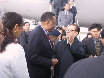 江主席的夫人王冶坪、中國(guó)國(guó)務(wù)院副總理錢其琛和夫人周寒瓊等陪同人員同機(jī)抵達(dá)休斯敦。