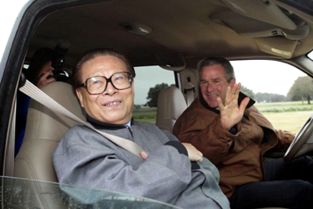 江主席這次訪美舉世矚目。一年前,江主席和布什總統(tǒng)在上海出席亞太經(jīng)濟(jì)合作組織第九次領(lǐng)導(dǎo)人非正式會(huì)議期間舉行首次會(huì)晤,雙方?jīng)Q定共同努力發(fā)展中美建設(shè)性合作關(guān)系。今年2月,布什總統(tǒng)訪華,兩國(guó)元首在北京就充實(shí)兩國(guó)建設(shè)性合作關(guān)系達(dá)成共識(shí)。這次江主席訪美,布什總統(tǒng)特意安排在克勞福德自己的牧場(chǎng)接待江主席,體現(xiàn)了兩國(guó)領(lǐng)導(dǎo)人之間的密切關(guān)系和對(duì)發(fā)展兩國(guó)關(guān)系的高度重視。兩國(guó)元首舉行會(huì)談,就發(fā)展中美建設(shè)性合作關(guān)系和重大國(guó)際及地區(qū)問題深入交換了看法,達(dá)成了一系列重要共識(shí),再次強(qiáng)調(diào)了中美平等友好合作對(duì)兩國(guó)和世界的重要性。雙方?jīng)Q定加強(qiáng)兩國(guó)高層戰(zhàn)略對(duì)話和交往,在雙向互利的基礎(chǔ)上加強(qiáng)反恐交流與合作,加強(qiáng)在經(jīng)濟(jì)貿(mào)易方面的合作,恢復(fù)兩軍交往和副外長(zhǎng)級(jí)戰(zhàn)略安全、軍控和防擴(kuò)散等磋商。江主席闡明了“和平統(tǒng)一、一國(guó)兩制”的基本方針,強(qiáng)調(diào)了“臺(tái)獨(dú)”活動(dòng)對(duì)和平解決臺(tái)灣問題的嚴(yán)重危害性,要求美方恪守一個(gè)中國(guó)政策和中美三個(gè)聯(lián)合公報(bào),為中國(guó)完成祖國(guó)統(tǒng)一發(fā)揮建設(shè)性作用。美方重申堅(jiān)持一個(gè)中國(guó)政策、遵守中美三個(gè)聯(lián)合公報(bào)的原則,反對(duì)臺(tái)灣獨(dú)立。對(duì)中美之間存在的一些分歧,江主席強(qiáng)調(diào)應(yīng)本著相互尊重的精神,通過對(duì)話增進(jìn)了解、擴(kuò)大共識(shí)。