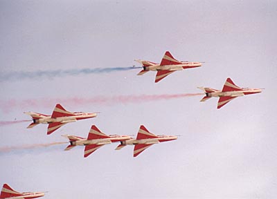 隨后,中國航空工業總公司研制生產的F-8IIM、F-7MG戰斗機、K-8型教練機、直九型飛機舉行特技飛行表演;俄羅斯‘試飛院’特技飛行隊的蘇27、蘇30戰斗機進行了特技飛行表演,中國航天工業總公司齊射2000枚航天火箭模型,引起一陣驚嘆。整個航展過程中,幾十架中外飛行愛好者駕駛的特技飛機,超輕型飛機,動力傘,熱氣球連續不斷地升空比賽,嗡嗡的發動機鳴叫聲和穿梭往來的小飛機給航展增添了許多節日氣氛,尤其受到孩子們的歡迎。