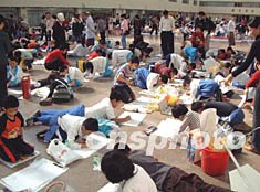 迎接“十六大”現場中小學生書法比賽在珠海舉行,共有五百名中、小學生參加。作者:石頭