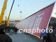 組圖:天安門廣場吊裝巨型標語牌的新景觀