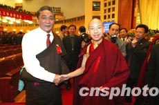 出席中國共產黨第十六次全國代表大會的熱地代表(左),八日在北京人民大會堂向特邀參加會議的十一世班禪額爾德尼.確吉杰布問候致意。作者:毛建軍