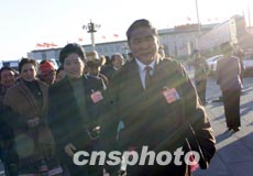 中共十六大十一月八日在北京人民大會堂召開,來自西藏的中共代表熱地身著民族服裝出席開幕式。作者:滿會喬