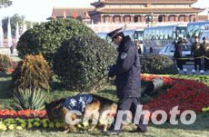 中共十六大十一月八日在北京人民大會堂召開,北京警方出動警犬在天安門廣場進行安全檢查。作者:滿會喬