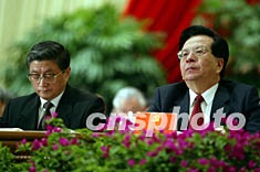 羅干與賈慶林八日在北京中共十六大的主席臺上出席開幕式。作者:毛建軍