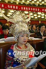來自貴州少數民族地區的黨員代表身著獨特的銀飾,盛裝出席中共十六大。作者:毛建軍