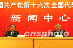 中國社會勞動保障部部長張左已(左)與中華全國總工會副主席張俊九,十一日在中共十六大新聞中心舉行新聞發布會并回答記者提問。毛建軍 攝