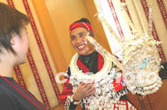 來自貴州的苗族代表張庭真十二日在中共十六大新聞中心接受記者訪問,談少數民族地區的生活變化。作者:毛建軍