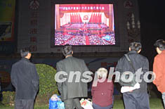 十四日晚,北京市民冒著寒風在北京火車站廣場觀看胡錦濤在中共十六大上投票的電視新聞。作者:史利