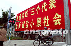中共十六大閉幕不久,海南省海口市國興路旁十八日掛出“全面實踐‘三個代表’全面建設小康社會”的巨幅宣傳標語牌。作者:鄒憲