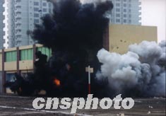 26日,成都首次反恐怖演習。在某跨國公司辦公大樓對面一座商場內,一直注視事態發展的最后一名恐怖分子,眼見計劃失敗,絕望地以人體炸彈的方式進行瘋狂報復。作者:劉真