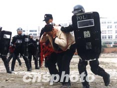 26日,成都首次反恐怖演習。圖為在A國駐蓉辦事處門前參與鬧事者,在準備逃跑時被民警用高科技裝備“網槍”網住。作者:劉真