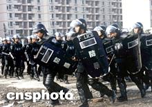 身穿最新式防暴盔甲服、手拿盾牌的防暴隊員演習架設盾牌防護墻,準備在A國駐蓉辦事處和鬧事人群之間形成隔離和警戒區。作者:劉真