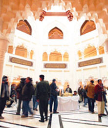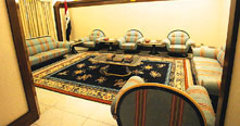 這個名為“蘇朱德”的薩達(dá)姆官邸占地面積龐大,裝飾著精美圖案的厚重鐵門正對著官邸主樓。在通向主樓的柏油路兩邊是開滿鮮花的花園和碧綠的草坪。這個三層高的拱型建筑內(nèi)部裝修豪華氣派,在八面體的墻上都雕刻著贊美薩達(dá)姆的詩句。天花板上垂下來巨大的枝型水晶吊燈。大廳旁邊還擺放著一張長方形的大餐桌。