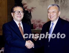 中國國家主席江澤民十一日在北京會見前來述職的香港特別行政區行政長官董建華。作者:鄭萍萍