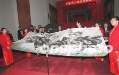 旅澳華人畫家姚迪雄先生(右),十八日在北京中國革命博物館開幕的個人畫展上,向北京奧林匹克博物館敬贈《八駿圖》大幅國畫。作者:鄒憲