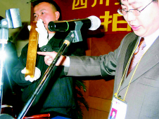 今天上午9點,距離正式開拍還有一個小時,設在成都人和賓館會議室里的拍賣現(xiàn)場已是人聲鼎沸,從全國各地趕來的多家媒體紛紛搶占有利地形,而“競拍席”上的買家則在最后時刻才神秘亮相。此前記者獲知,組織此次拍賣的四川金通拍賣行一直對參與競拍的三家企業(yè)避而不談,只透露其中有著名電器銷售公司成都國美電器,而另兩家則是四川本省的企業(yè),但是在競拍現(xiàn)場記者注意到,只有代表成都國美電器的28號競買者比較活躍,而另外兩家企業(yè)的競買人卻出人意料地沒有舉牌參加競買,結果,在開場20分鐘后兩塊金錠就毫無懸念的以底價62萬元被拍出。
