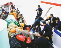 李彥民的女兒萍萍是第一個被送上救援船的旅客。這位6歲的小姑娘是被放在一只筐里,用繩子吊到救援船上的。