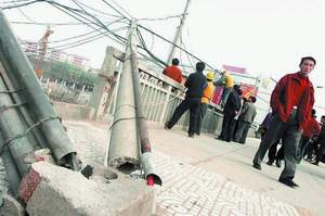 中新網1月3日電 昨天凌晨5時許,一輛加長貨車路過廣州市廣園西路王圣堂與京廣鐵路交匯處時,不慎掛上空中鋪設的民用電纜,拉斷四根用于架設電纜的水泥桿,導致近300米電纜垂落在地。因搶修該電纜造成京廣線廣州段中斷一個多小時,其中有一段電纜險些碰上京廣鐵路2.7萬伏鐵路專用高壓電網。