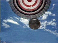 一月五日晚七時許,“神舟”四號飛船在太空翱翔七天后在內蒙古中部草原成功著陸,順利回收。圖為電腦模擬的“神舟”四號回收艙返回圖。