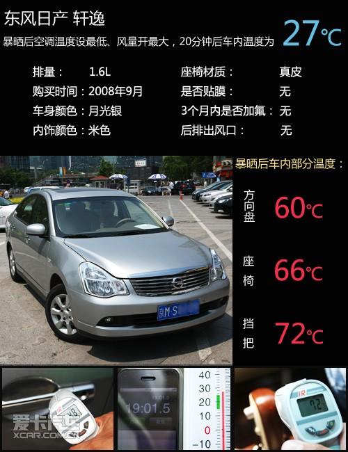 軒逸空調(diào)運行時發(fā)動機十分乖巧,車內(nèi)除了因測試需要調(diào)到最大的風(fēng)機聲之外,其他噪音被控制得很小,對得起舒適宜家的公眾形象?照{(diào)20分鐘的賣力工作讓車內(nèi)下降了30多度,對于08年購買的軒逸來說表現(xiàn)可圈可點。