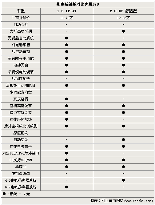 如果說今天對比的兩款車中,新凱越就是這個問題的答案。無鑰匙啟動系統、真皮包裹座椅、前排座椅加熱等高級配置同級別車型無人能及,比起高一級別的B70同樣體現出明顯的優勢。AUX/USB/iPod外接音源和超過6個以上的車載音響系統,吸引來喜愛音樂的朋友們不成問題。身為車系中的最低配版本,2.0 MT 舒適型的奔騰B70還是有比較亮眼的配置,可調大燈高度、自動空調等成為區別于新凱越的優勢體現。