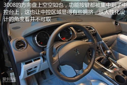 標致3008全系車型都沒有采用多功能方向盤設計,方向盤上應該有的功能都被搬到了中控臺上,事實上這并非理想的設計。而中控空調出風口下方那一排類似于飛機駕駛艙上的功能按鍵則體現了法國式幻想主義情節。而中控臺右邊那一個真皮包裹的扶手可能裝飾的意義大于其實用性。