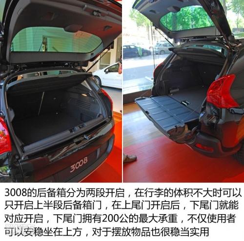 3008的后備箱分為兩段開啟,在行李的體積不大時可以只開啟上半段后備箱門,在上尾門開啟后,下尾門始能對應開啟,利用強化金屬支撐臂,下尾門擁有200公斤的最大承重,上面覆蓋著平面強化塑料,不僅使用者可以安穩坐在上方,對于擺放物品也很穩當實用。