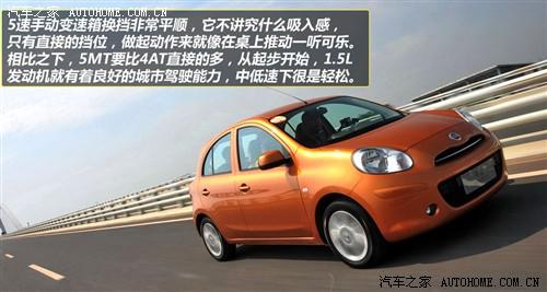 目前,該車搭載的是一臺全新的1.5L發動機(代號HR15DE),最大功率79Kw;最大扭矩138N·m。要知道在歐洲,瑪馳還有另外兩款發動機可供選擇,一臺是最大功率為59kw,最大扭矩108N·m的1.2L 3缸發動機;另一臺則是1.2L機械增壓直噴發動機,最大功率72kw,最大扭矩142N·m;與這兩款發動機相匹配的是5AT或CVT變速箱。然而,引進到國內后,東風日產瑪馳的動力總成部分改為了現在的1.5L發動機+5MT或4AT變速箱。