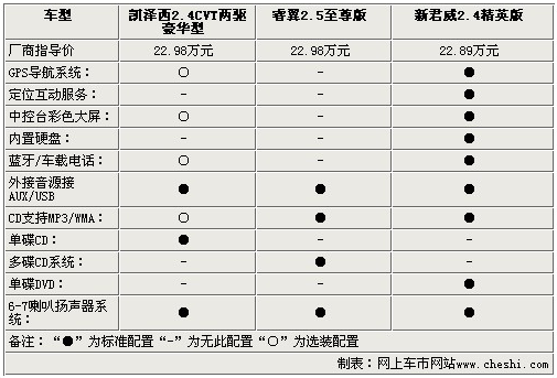 影音系統方面,三款車都為使用者提供了多揚聲器的配置,除了AUX/USB接口外,凱澤西還配備了單碟CD,而睿翼則配備了更為便利的6碟CD系統,新君威為單碟DVD。通過以上參數配置方面的比較,對于三款22.98萬左右的中級車,配置方面基本打成平手,僅在一些細節方面有所出入,不過動力方面凱澤西確是實實在在的戰勝了睿翼和新君威,幾乎將2.4L引擎的動力發揮到了極致。