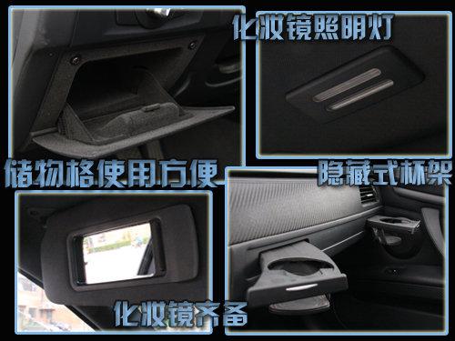 在燈光調節的下方設計有獨立的儲物空間;副駕駛位置在銀色提示條下隱藏著兩個水杯架;兩側的遮陽板都設有化妝鏡,并配有獨立的照明燈;