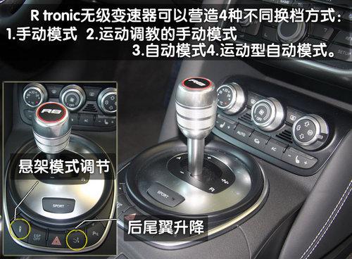 作為這臺發動機的動力輸出,奧迪R8可以選配“R tronic無級變速器”,或手動6速變速器,不過試駕的車輛均為R tronic無級變速器。這臺R tronic無級變速器的優勢在于可以營造4中不同的換檔方式即:1.純手動模式2.運動調教的手動模式3.純自動模式4.運動型自動模式。利用變速器的模仿依然能夠在手動狀態下提供6個前進檔位的傳動比。
