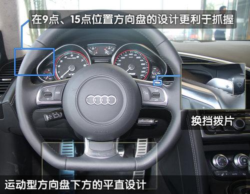通過駕駛室內的轉速表可以看出,這臺發動機的轉速范圍可以達到最高9000轉,而“紅色區域”從8000轉才剛剛開始。也就是說有它別于一般的車輛,為了得到最佳的功率和扭矩輸出,讓R8的發動機保持在5-8千轉進行工作是相對合理的。這時,每一個聽到R8呼嘯的人也許都會說:“喔,我想那輛車一定非常棒!”奧迪R8提供了三幅真皮包裹的運動型方向盤,在10點和2點位置都有凸起從而方便駕駛員的抓握。多功能方向盤后方的換檔撥片可以在手動模式下實現類似F1賽車式的換檔方式。