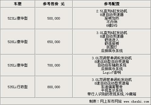 從經銷商處得到的消息來看,目前接受預定的新5系Li為3款“豪華版”車型和一款從未出現過的“行政版”車型。“豪華版”在寶馬的車型分類體系中屬于最高級別,但“行政版”是首次出現應該會是寶馬新5系li的旗艦款式。不過根據以往寶馬對車型的分布來看,在豪華版之下還包括領先型、標準型等,這也就意味著在上述50到80萬元的價格區間內,新5系Li還將衍生出更多配置版本的車型,其中也一定不乏一些價位更低的車款。
