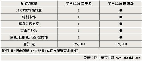 世博版320i是根據寶馬320i的豪華版衍生的,它在320i豪華版的基礎上增加了17寸的輪轂及輪胎、內飾上使用了特別的棕色實木裝飾條以及白色的車身外觀色,并且在車輛尾部可以貼上一個專屬的世博徽章。售價上相比普通320i豪華版價格提升8000元,而據經銷商方面介紹通常情況下4只同款式鋁合金輪轂的價格也在萬元左右。