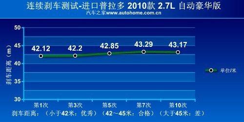 加速偏弱或許對一些人來說不是問題,而剎車無論如何都不能含糊。這一點上普拉多的表現得很稱職。盡管由于車身較高,剎車姿態看起來有些令人不安,但從100公里/小時剎車到靜止只需要42.85米,而且剎車一直穩定在43米左右,已經算是非常不錯的成績。