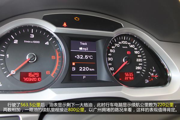 3天半下來總共行駛了563.5公里,油表顯示剩下一大格油,此時行車電腦顯示續航公里數為220公里,兩數相加,一箱油的續航里程接近800公里,雖然與理論數據有所出入,但以廣州這樣擁堵的路況來看,這樣的表現已值得肯定和認同。