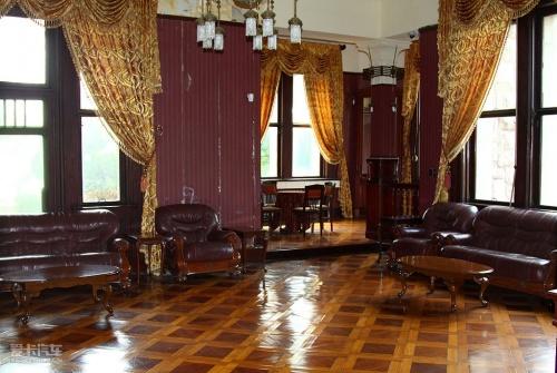 樓內(nèi)裝飾陳設(shè)異常華麗:銅制燈具、彩瓷鑲嵌壁爐依然光亮如新、雕花的天花板造型各異。