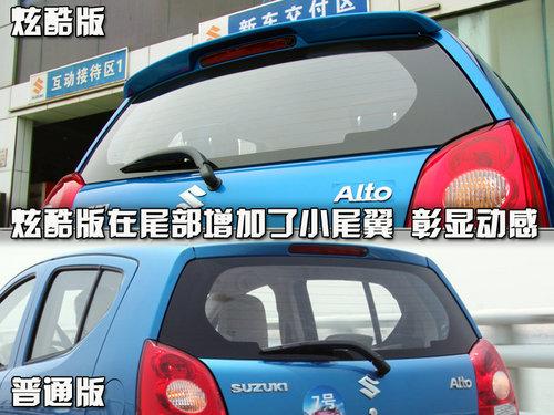 再來看看車身側面,這里的變化就比較明顯了,共有兩處。不過,也都是我們可以自己動手來改變的,車門上增加一條粗狂的黑色防擦條,前端的鍍鉻部分由ALTO的印記。底部還假裝了側裙,讓底盤擁有更明顯的貼地感。