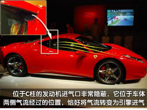 當(dāng)通過車身兩側(cè)的氣流經(jīng)過駕駛室后方的C柱時候,隱藏在C柱內(nèi)部的引擎進(jìn)氣口恰好在這里等待著新鮮的空氣。通過位于C柱內(nèi)的引擎進(jìn)氣口,發(fā)動機(jī)將獲得充足的新鮮空氣,并且法拉利的工程師還告訴我們:當(dāng)車輛的時速達(dá)到100公里/小時開始,由于氣流經(jīng)進(jìn)氣口以及進(jìn)氣道所產(chǎn)生的“動態(tài)增壓”效應(yīng),會使發(fā)動機(jī)的功率額外增加5馬力,最終實現(xiàn)570匹馬力的最大功率。