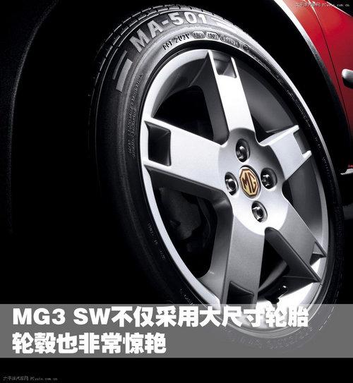 第一眼看到MG3sw,我們就會被純正的英式風格所震撼。在MG3sw的車頭部分,我們可以看到很多分體設計的元素,前大燈、霧燈、中網都采用了對稱的排列方式,在蘊含動感的同時也有一絲紳士風范。車頭和車尾低平而飽滿,引擎蓋上3道線條均勻地勾勒出一種力量感。最小離地間隙大于160mm的高通過性底盤,與車身顏色不同的全身大包圍,都表現出了MG3sw所具有的通過能力。