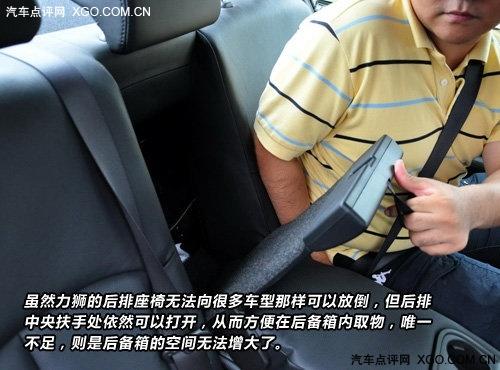 當然如果排除后排的第三個人,一個人或者兩個人坐在后面,還是很舒適的,后排的中央扶手不僅寬大,而且高度適中,水平放置后,位于杯架后的部分真皮包裹,十分柔軟,肘部放在上面的角度也合適,即使杯架內放置了水瓶,乘客的胳膊也不會受到絲毫影響。更不會出現乘客為了胳膊支撐在扶手上而采取一個很不舒服的坐姿的情況。力獅的后排座椅無法放倒,卻可以從中央扶手的靠背處打開,方便從后備箱內取物。