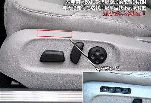 不過必須批評的是邁騰一方面在積極的增配,改善用戶體驗,另一方面還不忘簡配,之前出現在舒適型和豪華型上的座椅記憶功能在2011款全系中都被簡配掉了。
