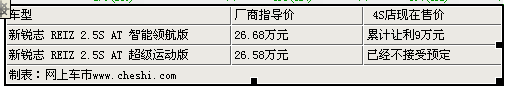 | 新銳志 REIZ 2.5S AT/MT特別導(dǎo)航版 | 24.58萬(wàn) | 21.08萬(wàn) | 3.5萬(wàn) | 有現(xiàn)車5種顏色全 |