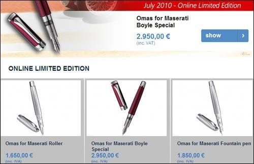 從上面的截圖可以看出,Omas for Maserati)簽字筆的售價為1650歐元,同樣銀色外觀的墨水筆售價為1850歐元,而Boyle Special是為紀念瑪莎拉蒂傳奇車型8 CTF而推出,限量生產70只,并且配合限量版8 CTF Boyle Special收藏車型一同發售。