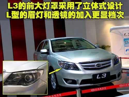 比亞迪L3的車燈設(shè)計也頗有特點,L型的鍍鉻燈眉一方面代表了L3的名字,也與中網(wǎng)的鍍鉻條相呼應(yīng)。立體式車燈罩也為前臉增添了一絲生氣,全系配備透鏡,夜間使用帶來更佳的照明聚光效果。