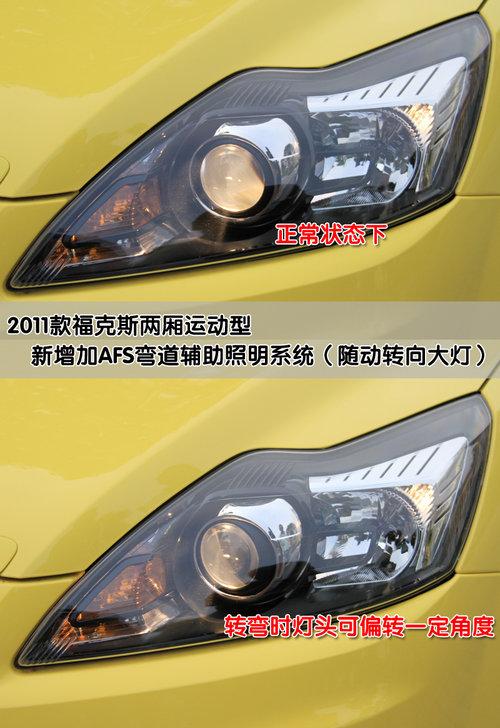 2011款福克斯兩廂運動型在安全配飾上新增加了AFS彎道輔助照明系統,AFS是彎道輔助照明系統的縮寫(俗稱彎道大燈)。AFS系統有三種形式:1、轉向頭燈形式的,就是頭燈內燈具可以左右旋轉8°至15°照明彎道死角。 2、利用獨立彎道照明系統的,就是在燈具里有一個固定的燈泡照向彎道,轉彎時候自動點亮。3、利用左右霧燈進行彎道時候照明,轉向時候對應彎內側霧燈亮起,照明彎道死角。而2011款福克斯兩廂運動型采用的是第一種形式,增強了夜晚行車的安全性。