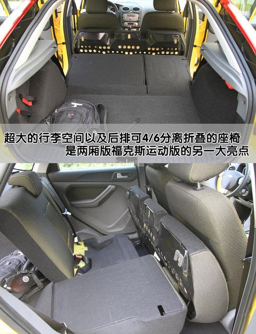 2011款福克斯兩廂運動型后排座椅可以6/4分離折疊,將坐墊完全提起后可以完全放平,方便裝載大體積的物品。后排座椅完全放倒后,行李倉容積由385L擴展至1245L。