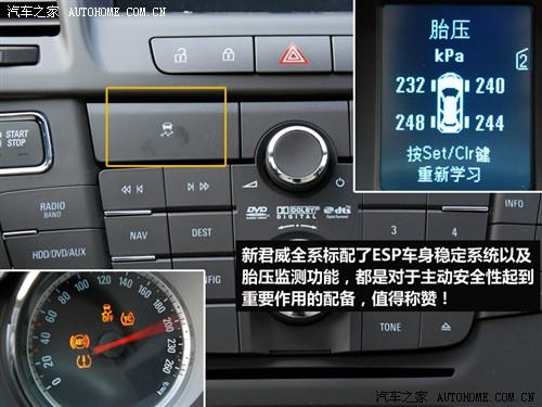 君威全系都備有胎壓監測系統,直接式胎壓監測將傳感器植入輪胎內,實時監控每條輪胎的胎壓狀況,駕駛員可以從行車電腦中直接調出壓力數值,做到心中有數,雖然有時會有數值不準的狀況發生。另外2010款君威全系都配備了安吉星系統,購車者可免費使用一年,體驗定位、呼叫和緊急救援等服務。