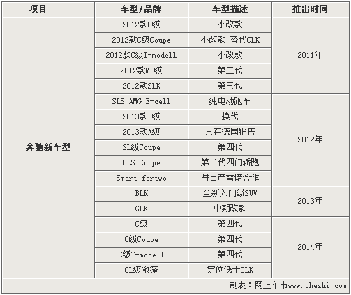 雖然奔馳全新一代CLS轎跑車(chē)將在巴黎車(chē)展發(fā)布,但是正式上市還要等到明年,而在2012年奔馳全新一代CLS雙門(mén)轎跑車(chē)也將推出。而已在國(guó)內(nèi)投產(chǎn)的奔馳新C級(jí)轎車(chē)將于明年推出小改款車(chē)型,在2014年將陸續(xù)推出全新一代C級(jí)轎車(chē)以及酷派和旅行版車(chē)型。此外,作為奔馳入門(mén)級(jí)SUV的BLK車(chē)型將于2013年正式推出,從進(jìn)一步抗衡寶馬X1等競(jìng)爭(zhēng)車(chē)型。